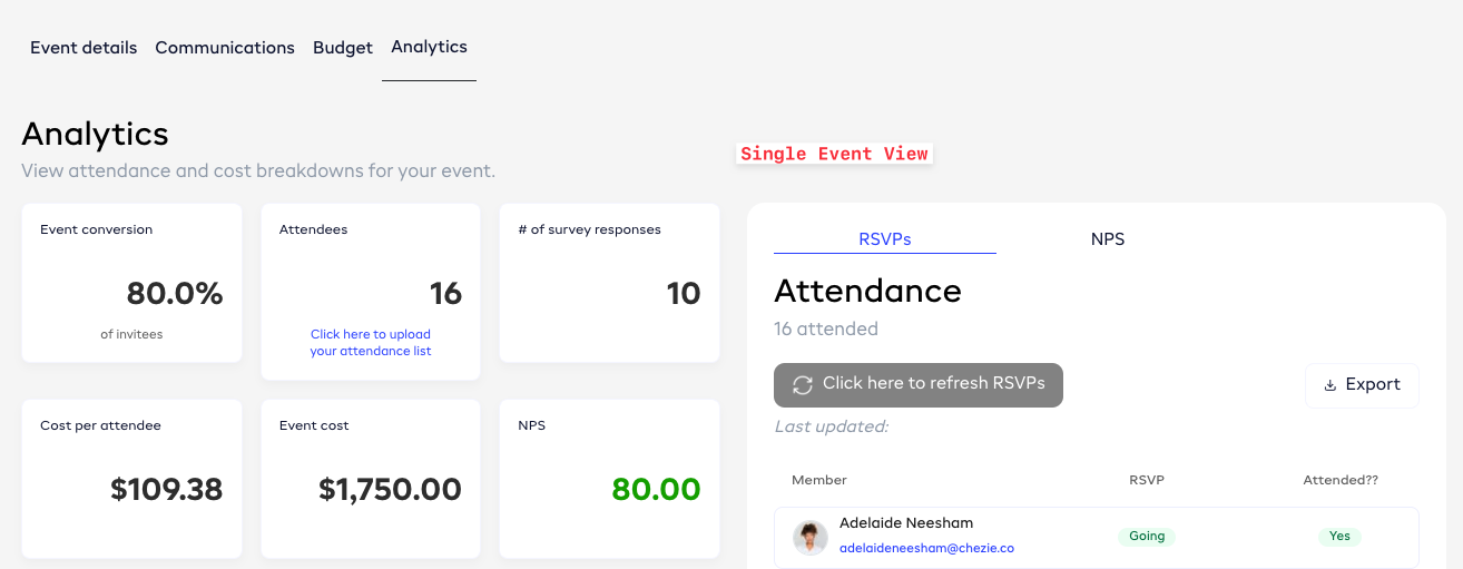 Single Event view - shows you the NPS score for all survey responses for the selected event