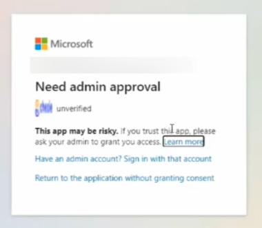 If you see this screen, then the application needs to be approved by an admin to complete the connection.