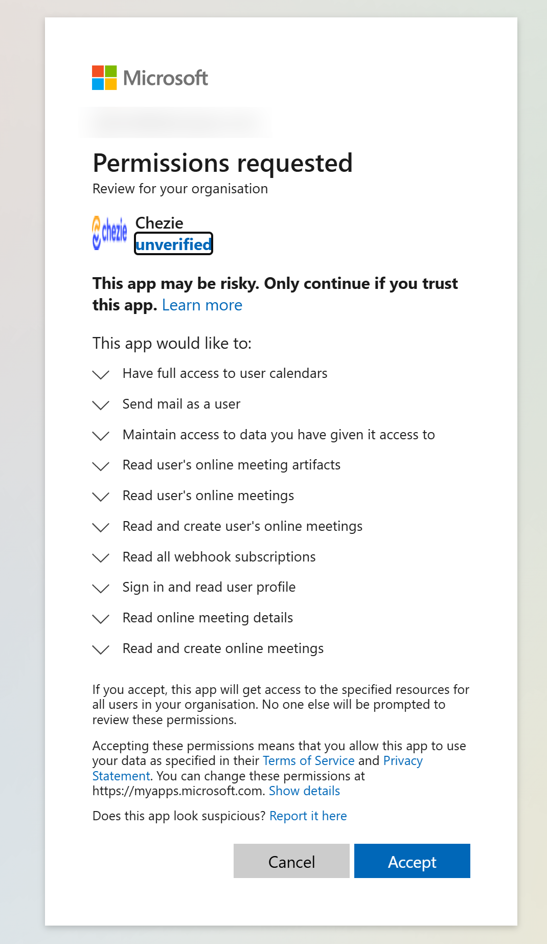 The best way to handle this is to temporarily give the service account admin permissions from your Azure portal, and then return to Chezie to complete step 5. If you don’t do this, the integration will be set up with the admin account you use to approve the application and not with the service account. Please note that you can remove these admin permissions as soon as the integration is complete.