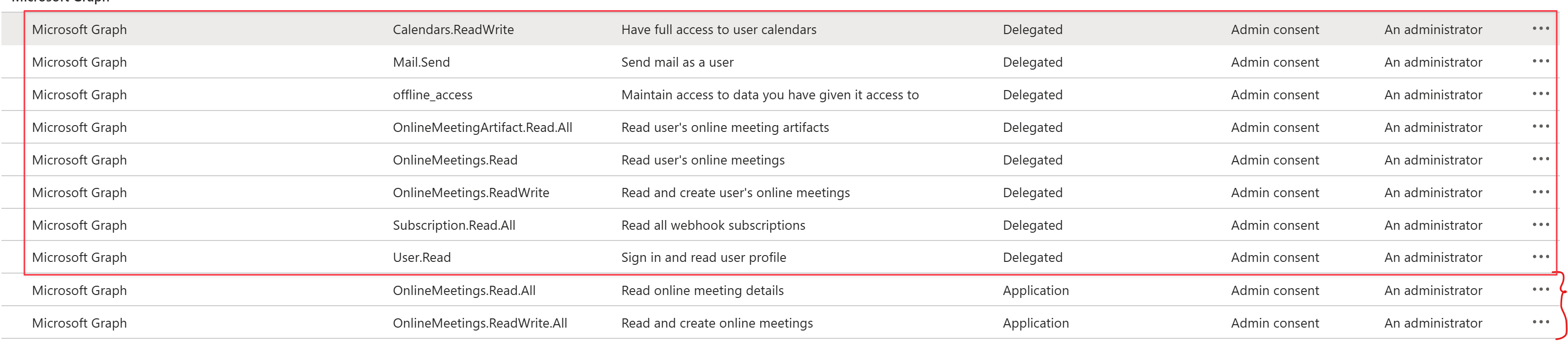Onlinemeetings.ReadWrite | Delegated | Read and create user online meetings | No (granted through user consent) |