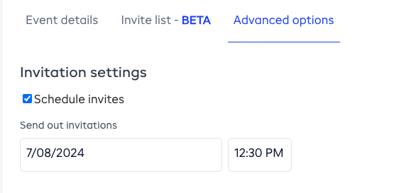 Scheduled invites allows you to pick when the calendar invites for your events will be delivered to your invite list. To turn this on, check the box next to the Schedule invites text and pick a date + time.