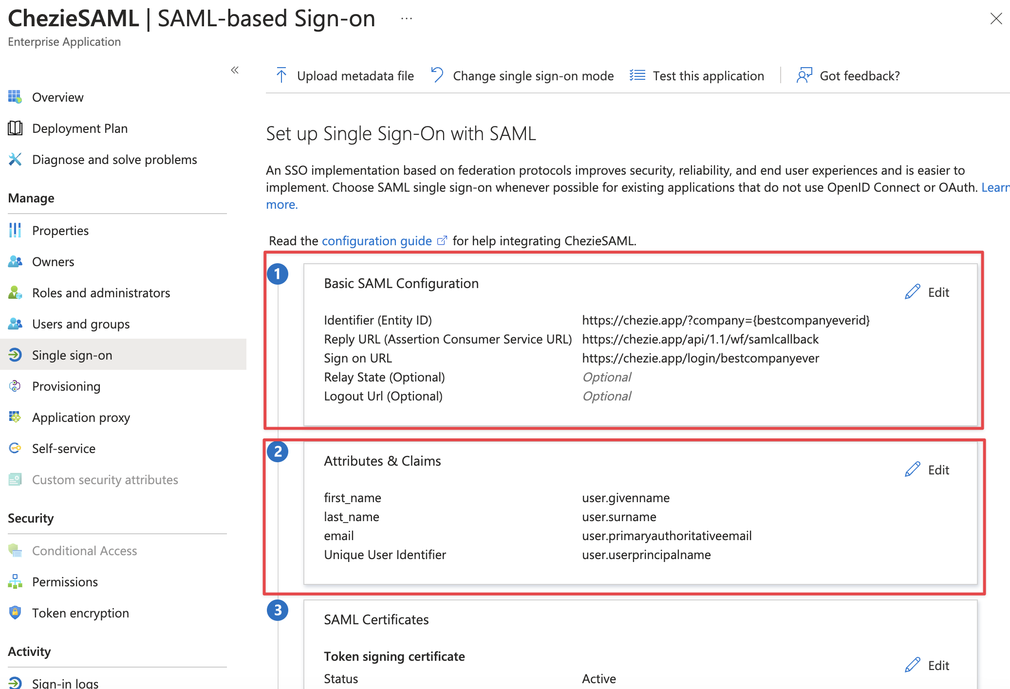 Configure SAML Settings and Mapping: In the application's settings, locate the SAML settings section. Provide the necessary information such as the Identifier (Entity ID), Reply URL, and Sign-On URL. These values will be provided by Chezie. This step involves mapping the user attributes from Azure AD to the corresponding SAML attributes required by Chezie.