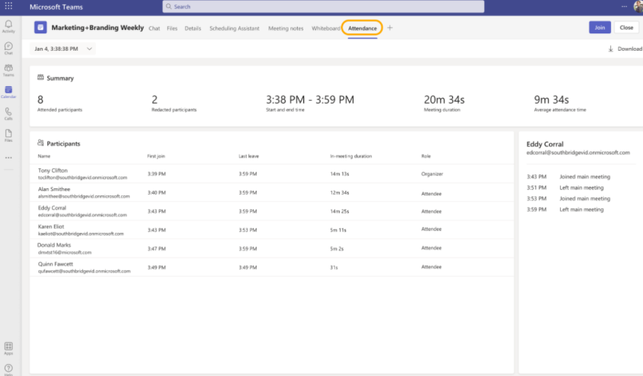 To view the attendance reports for meetings created in channels, click More actions > View meeting details, and navigate to the Attendance tab.