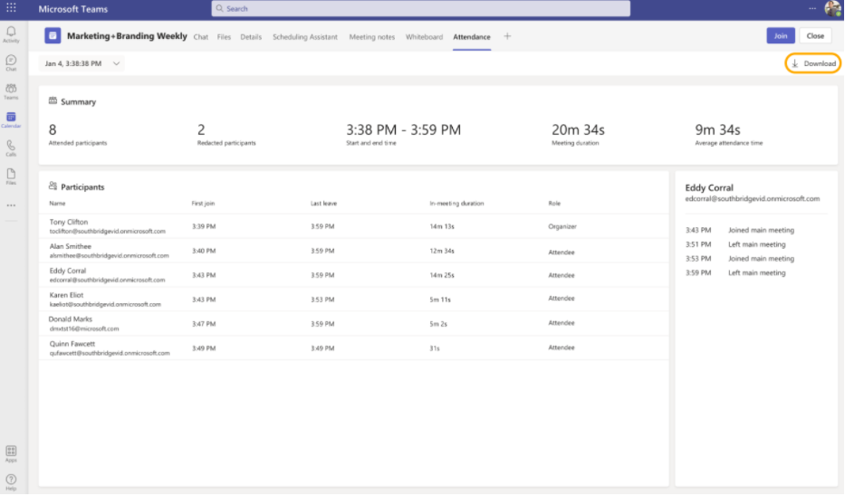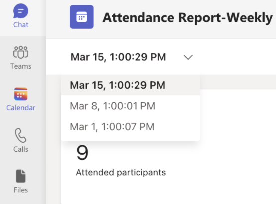 Note: In channel meetings, the attendance report is available only for the most recent meeting from the channel, but you can go to the meeting invite page in Teams calendar for all channel meeting attendance reports.