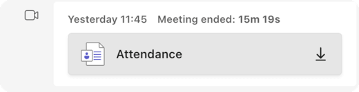 A tile labeled Attendance report will pop into the chat about five minutes after your meeting ends. Select it to download the CSV file.