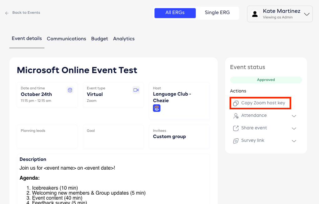 ERG leaders can now copy the host key for any meetings they create, allowing them to take host control, enable breakout rooms, create webinars, and more—while still benefiting from automatic attendance tracking.